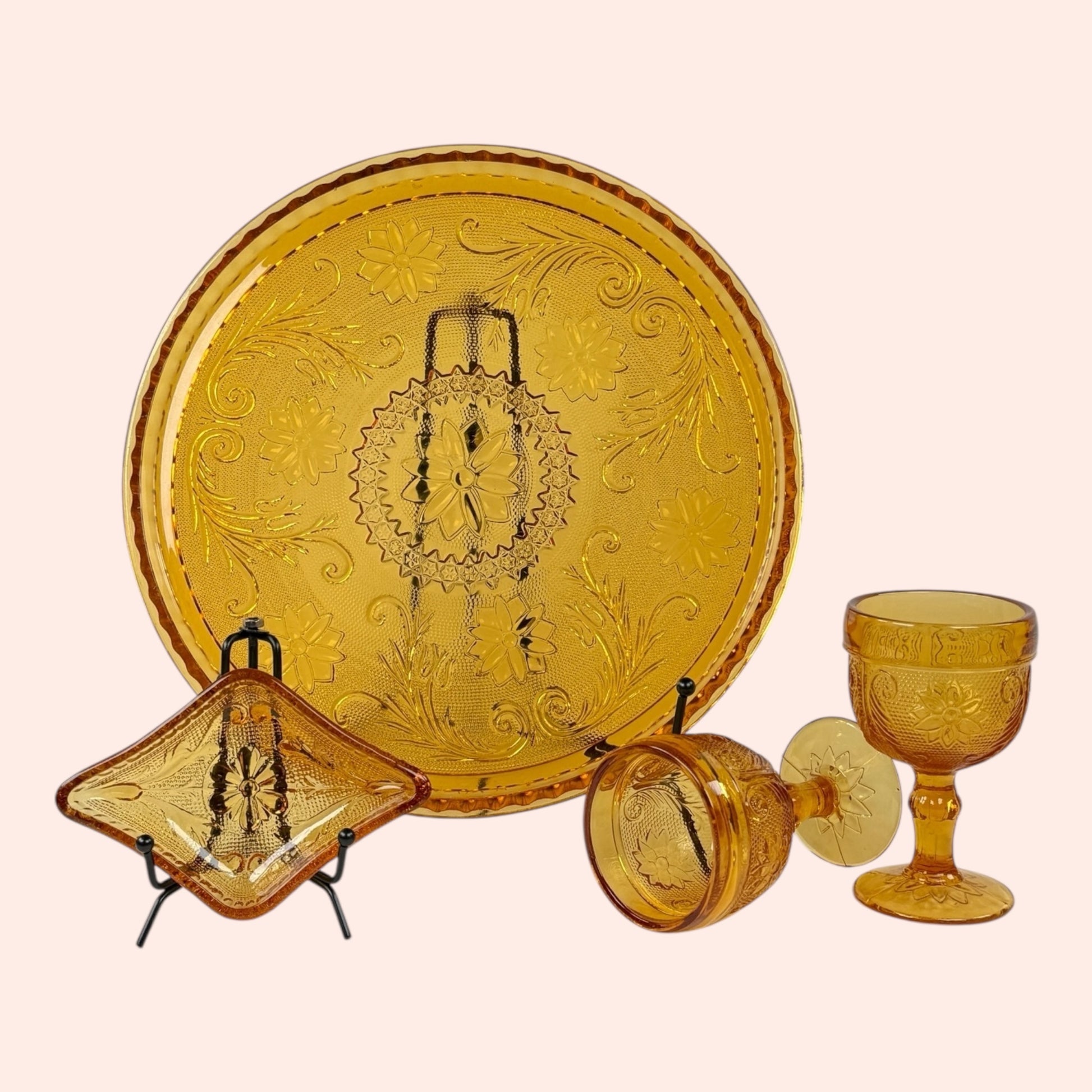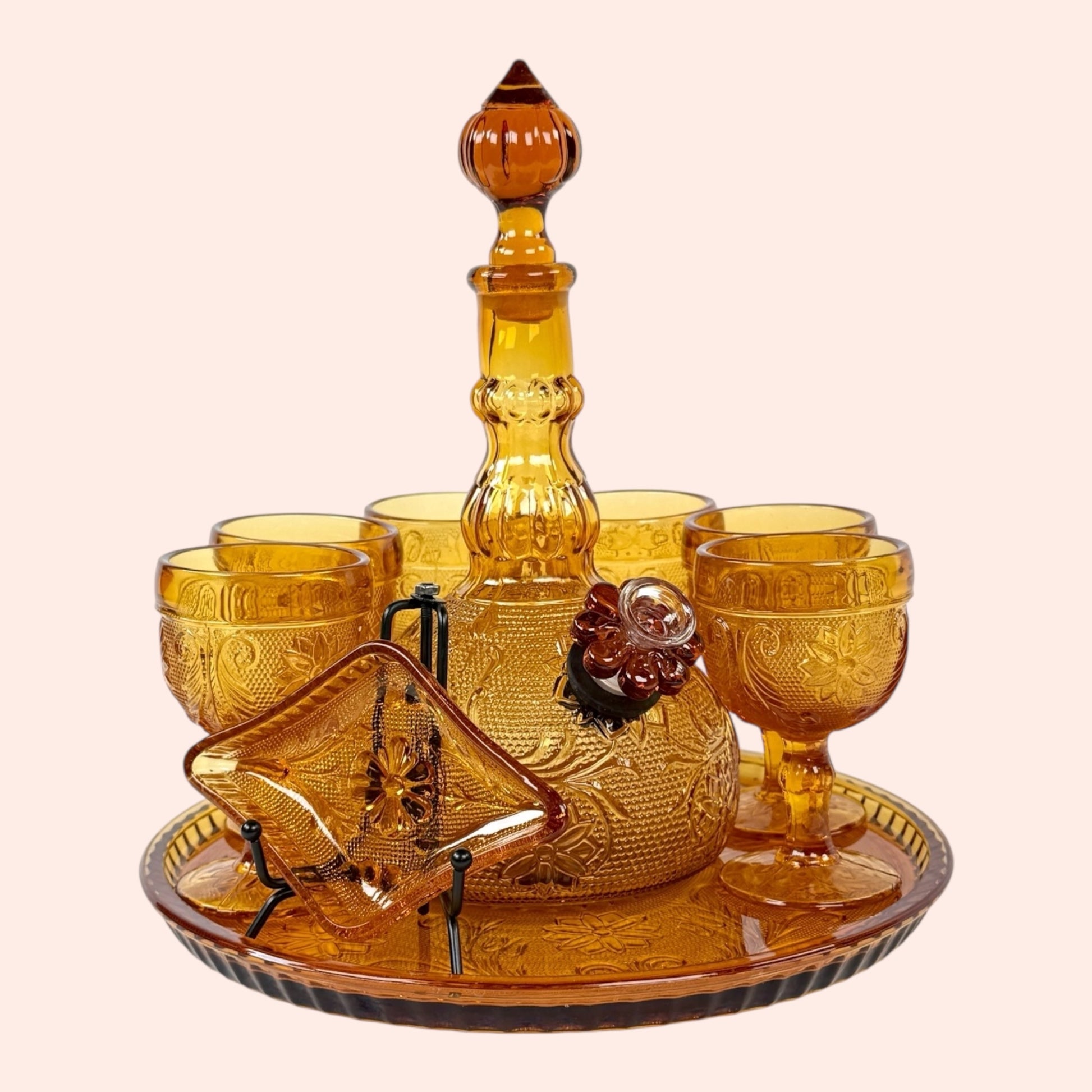 Indulge in luxury with this rare and exquisite vintage Indiana Glass Tiara set! This 1970s collection includes a decanter, six original wine glasses, small diamond ashtray, and serving tray. Perfect for hosting a sophisticated smoke sesh and truly a centerpiece in any home. Bowl included 🤎