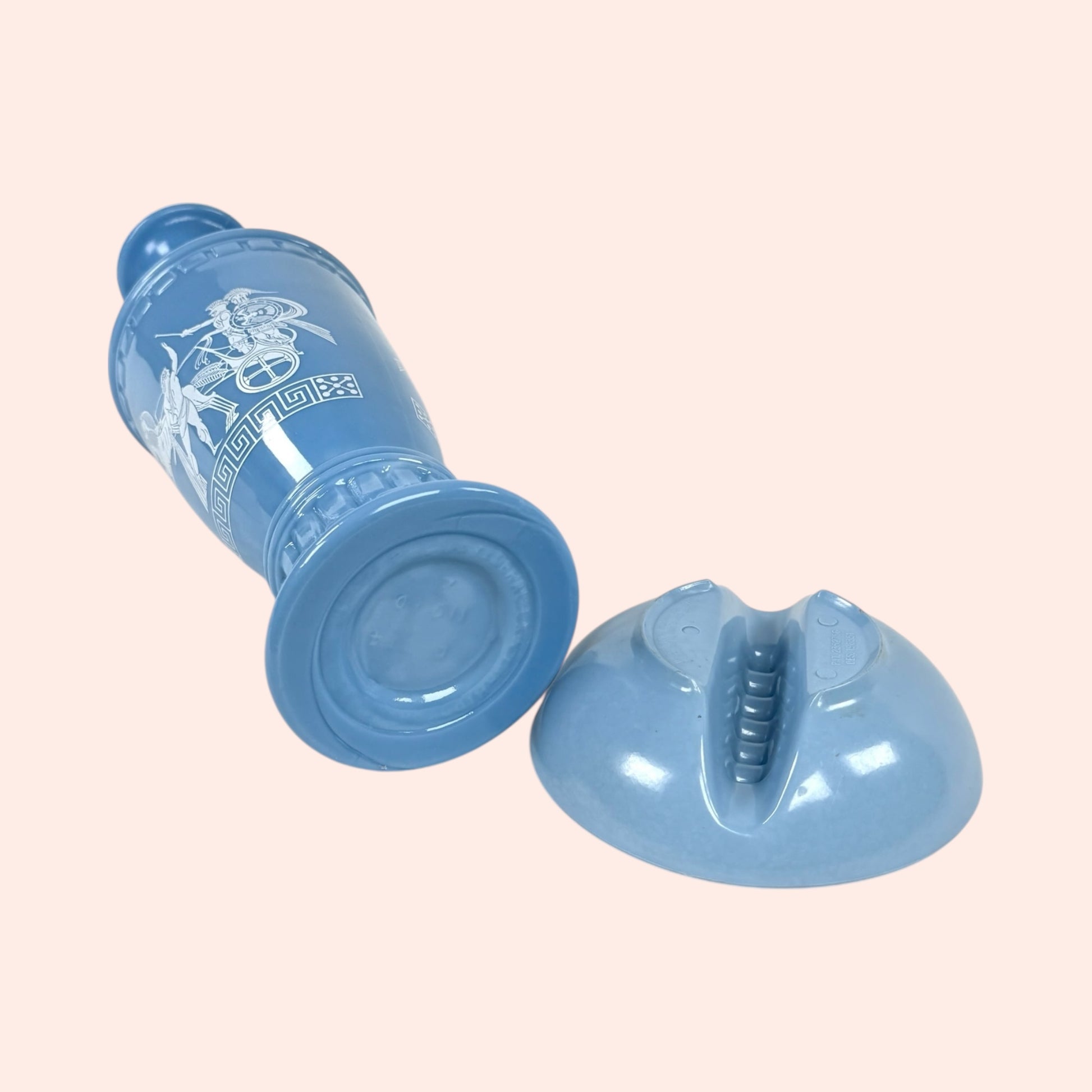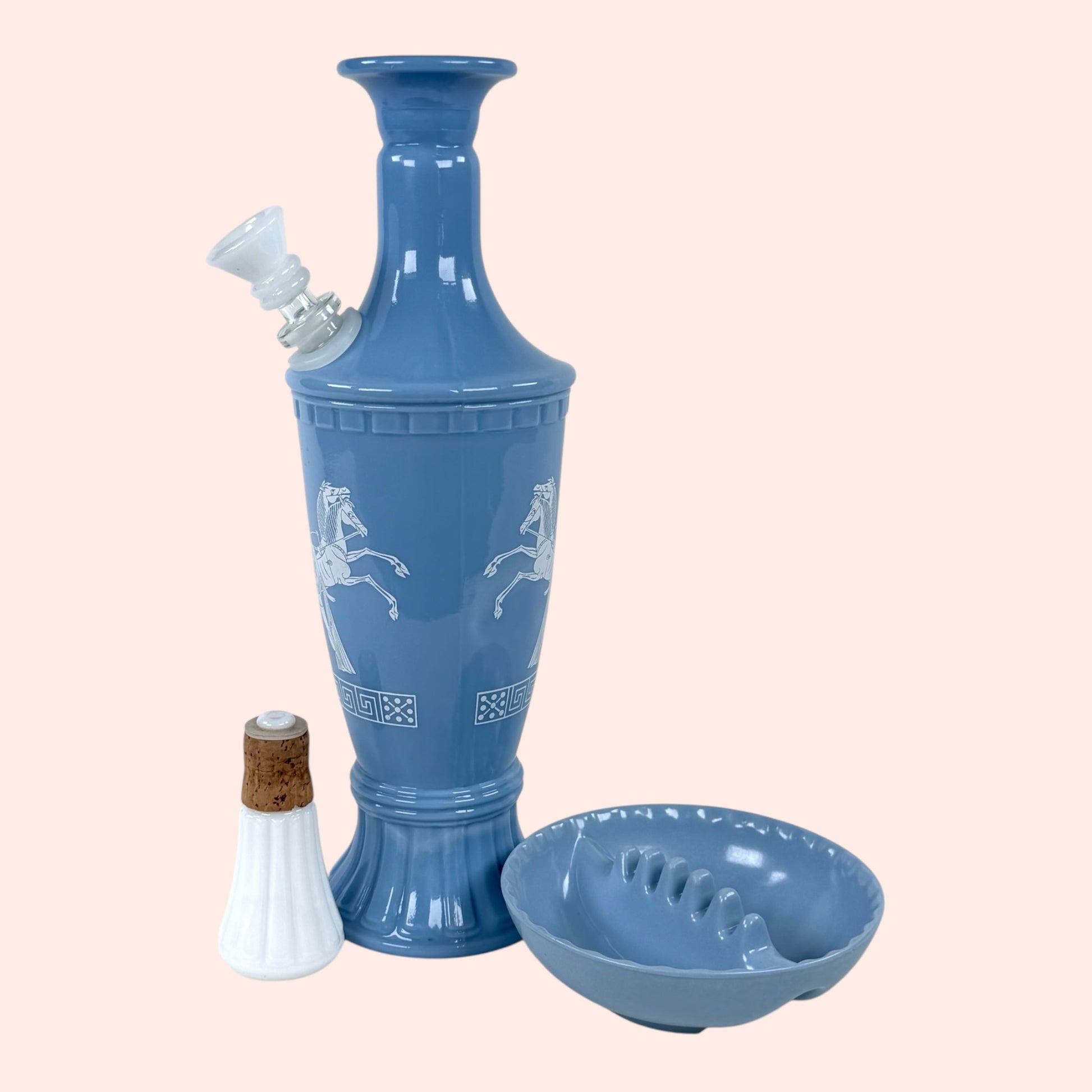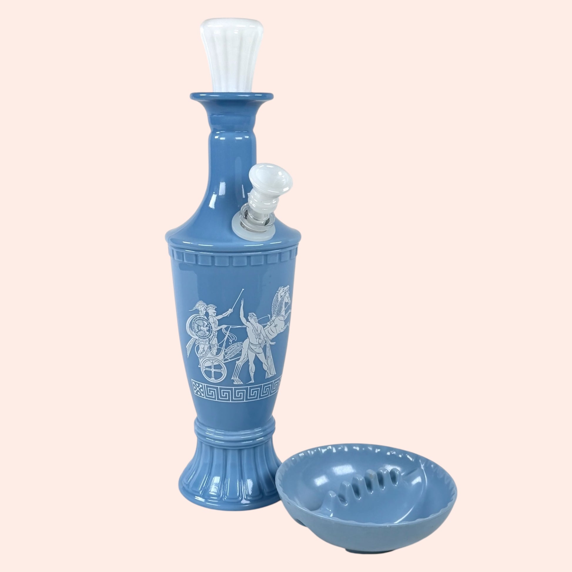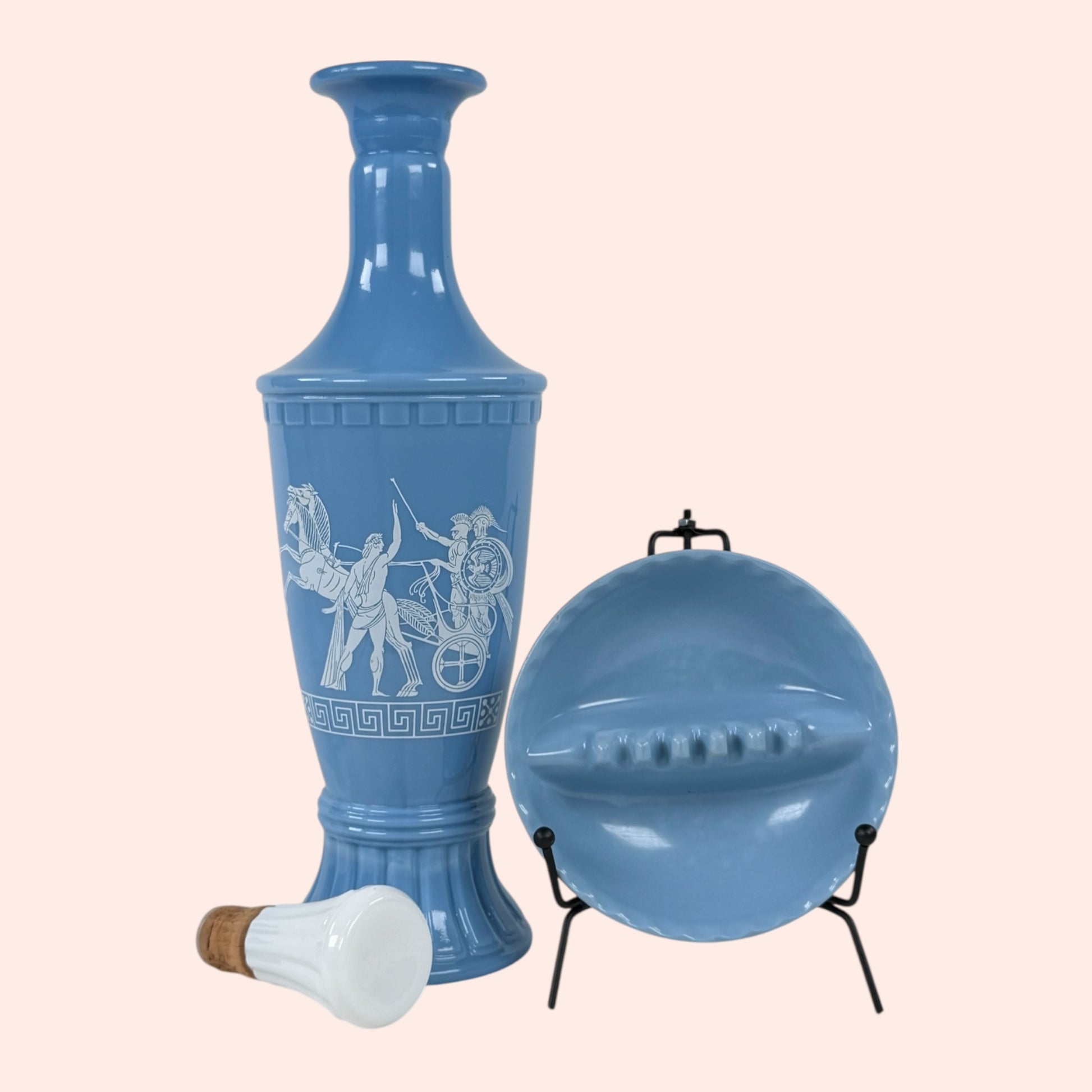 Show off your vintage style with this gorgeous piece! 🏺This Jim Beam 1960s Greek themed decanter omes with a custom bent stem and bowl as well as a matching retro 90s blue ashtray (plastic).