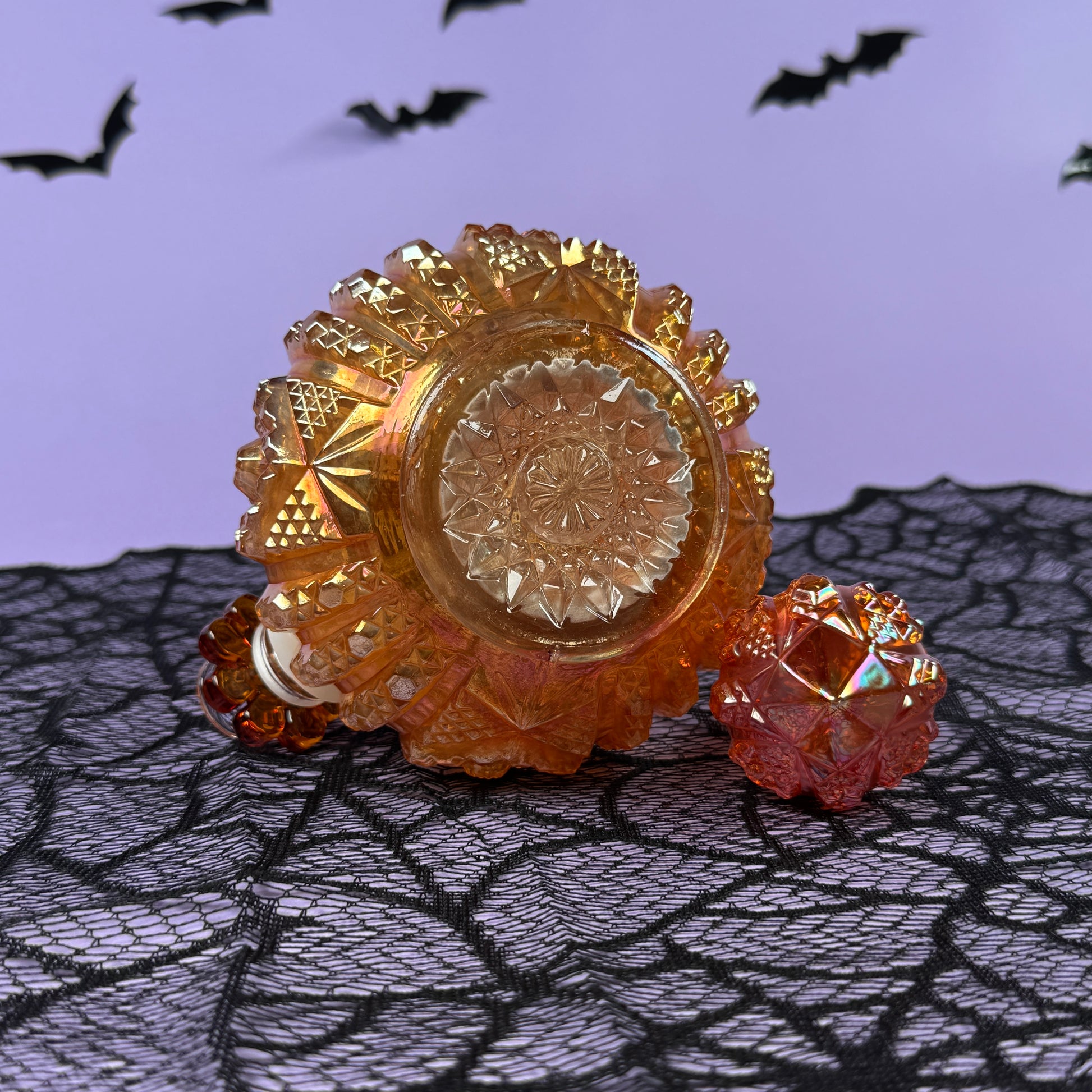 This rare marigold carnival glass set is giving me ultimate halloween candy fantasy! 🎃✨This set was made by Imperial Glass in the "daisy button" pattern, likely around the 1910s-20s. Due to age, there is some staining at the base which has been thoroughly cleaned and not actually "dirty". There is also some slight chipping on the base of the stopper, not visible when in use.